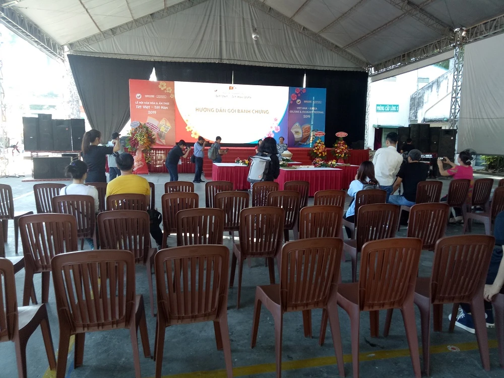 Sân khấu diễn ra hoạt động gói bánh chưng vắng người tham dự. Ảnh: TRÚC PHƯƠNG