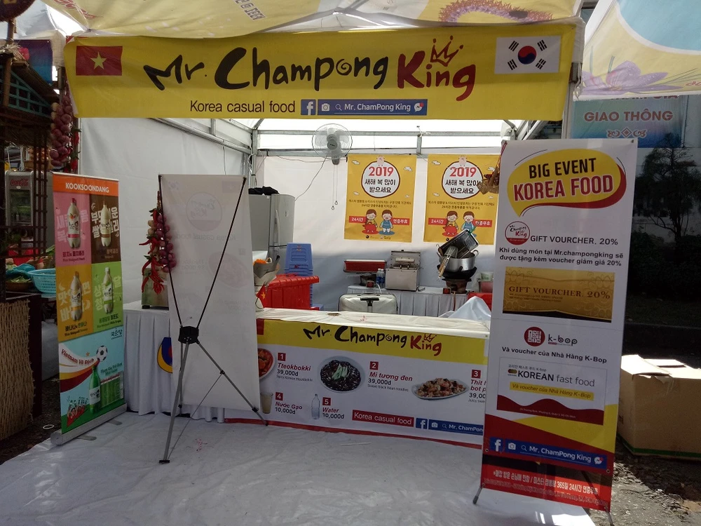 Một gian hàng bán các món Hàn nằm khuất sau sân khấu. Ảnh: TRÚC PHƯƠNG