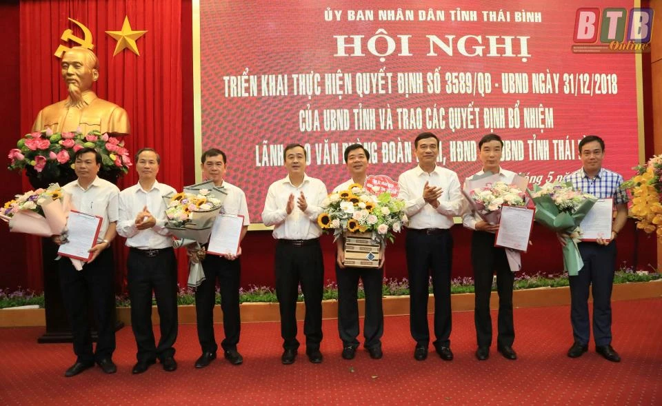 Lãnh đạo tỉnh Thái Bình trao quyết định và chúc mừng các cán bộ được bổ nhiệm.