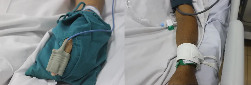 Bệnh nhân được quan tâm chi tiết nhỏ nhặt nhất từ bao tay giữ ấm (trái) đến dây cố định tay bản lớn (phải). Ảnh: HL