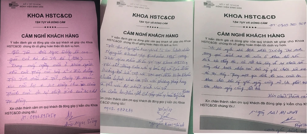 “Trong thời gian nằm ở khoa, tôi nhận thấy các y bác sĩ ở khoa đã chăm sóc chồng tôi tận tình, chu đáo, mỗi lần vào gặp, tôi đều thấy chồng tôi rất sạch sẽ và khỏe hẳn lên mỗi ngày. Ngoài ra, các y bác sĩ cũng ăn nói rất nhẹ nhàng, ân cần với người nhà bệnh nhân” - chị Nguyễn Thị Thu Phương, vợ của bệnh nhân Trần Văn Tươi (sinh năm 1967), nắn nót viết vài dòng cảm nghĩ gửi lại khoa Hồi sức tích cực chống độc của BV Bình Dân như thay lời cảm ơn.