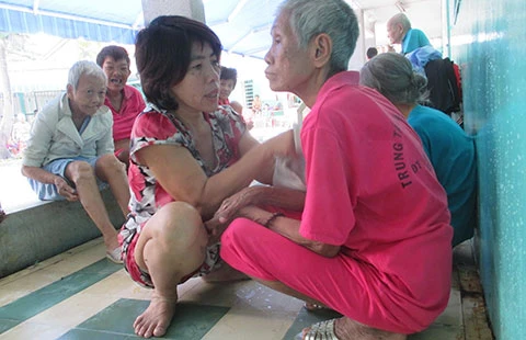 Ảnh 2. Chị Thu Oanh (trái) chăm sóc cho những bệnh nhân cùng khu trại. Từ công việc này, chị có thêm thu nhập để “lo cho con ăn học”. Ảnh: HM