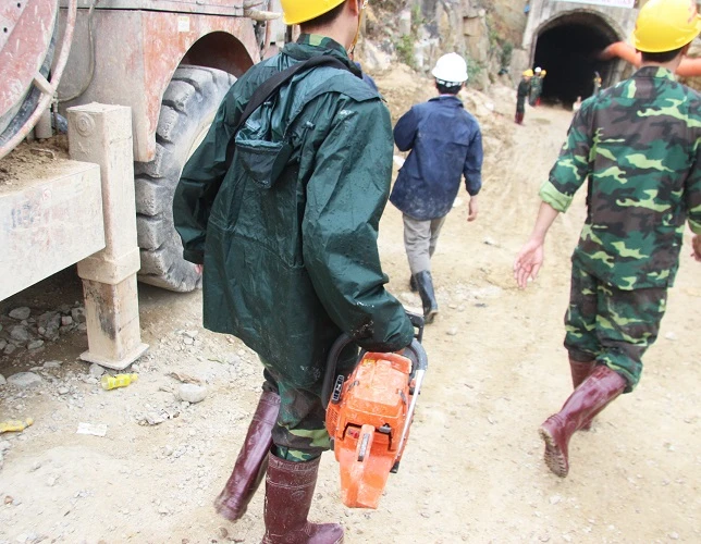 Sau hơn ba ngày đêm, sáng nay (19-12), công binh đã khoan thông đoạn hầm dài hơn 60 m. Hiện nay, nước và bùn từ bên trong tràn ra ngoài rất lớn.