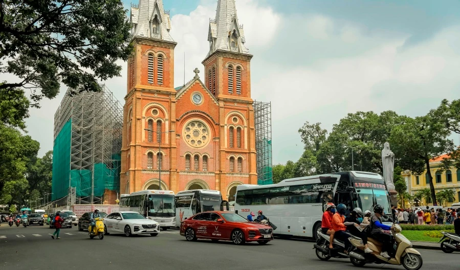 Hòa trong lòng xe cộ tại nhà thờ Đức Bà.