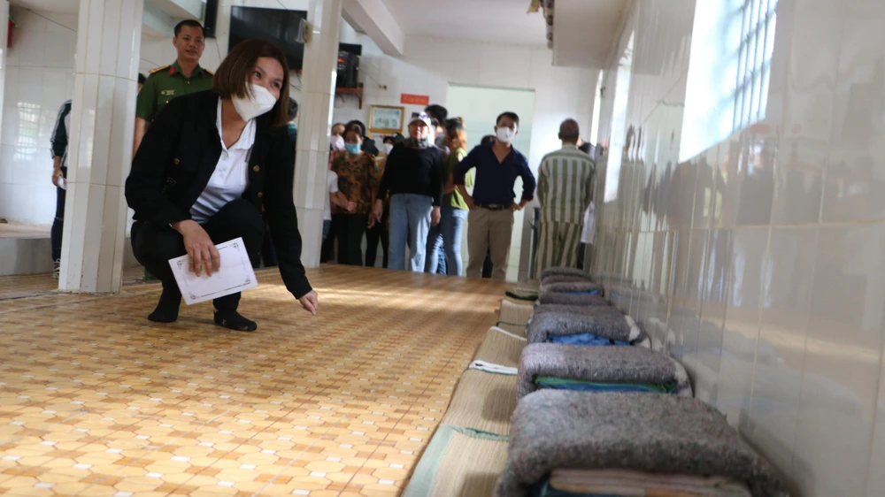 Một thân nhân đang quan tâm chỗ nằm của con em mình khi được thăm nơi giam. Ảnh: VÕ TÙNG |