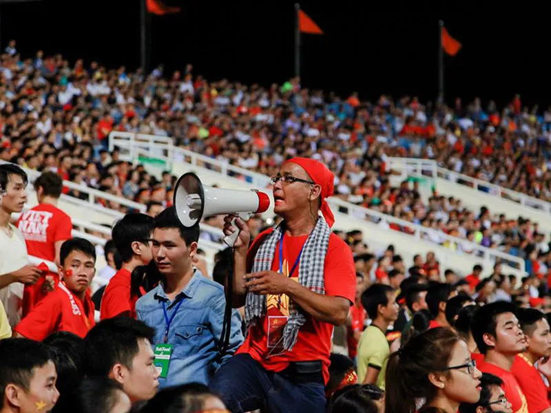 Hội trưởng VFS Trần Hữu Nghĩa hô hào các cổ động viên Việt Nam cổ vũ đẹp và fair play trên khán đài. Ảnh: CTV