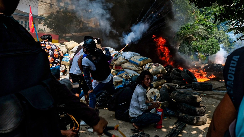 Người biểu tình chống lại lực lượng quân đội Myanmar tại thành phố Yangon. Ảnh: GETTY IMAGE