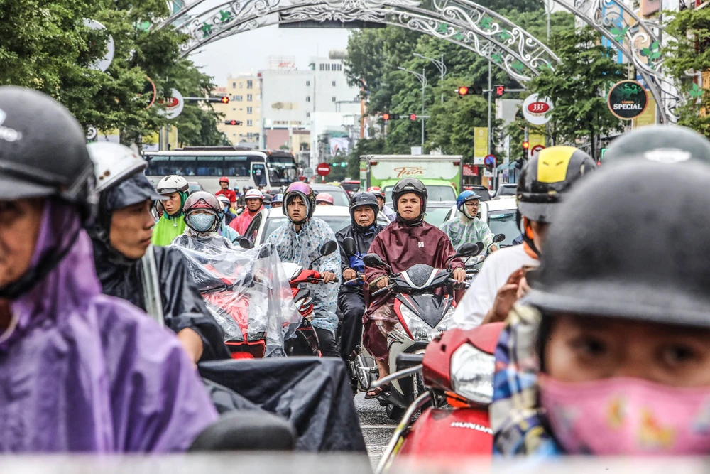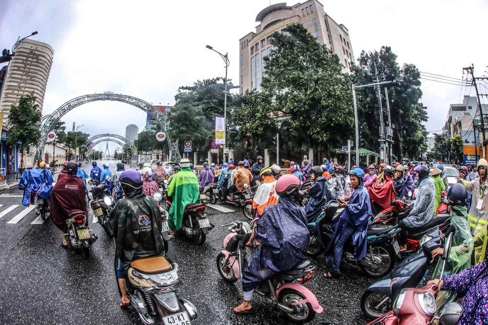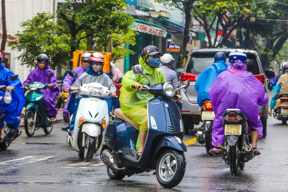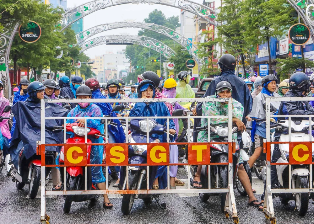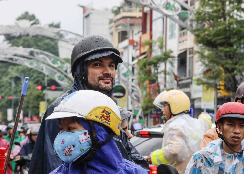 khách Tây vui vẻ chờ đợi trong thời tiết mưa gió.