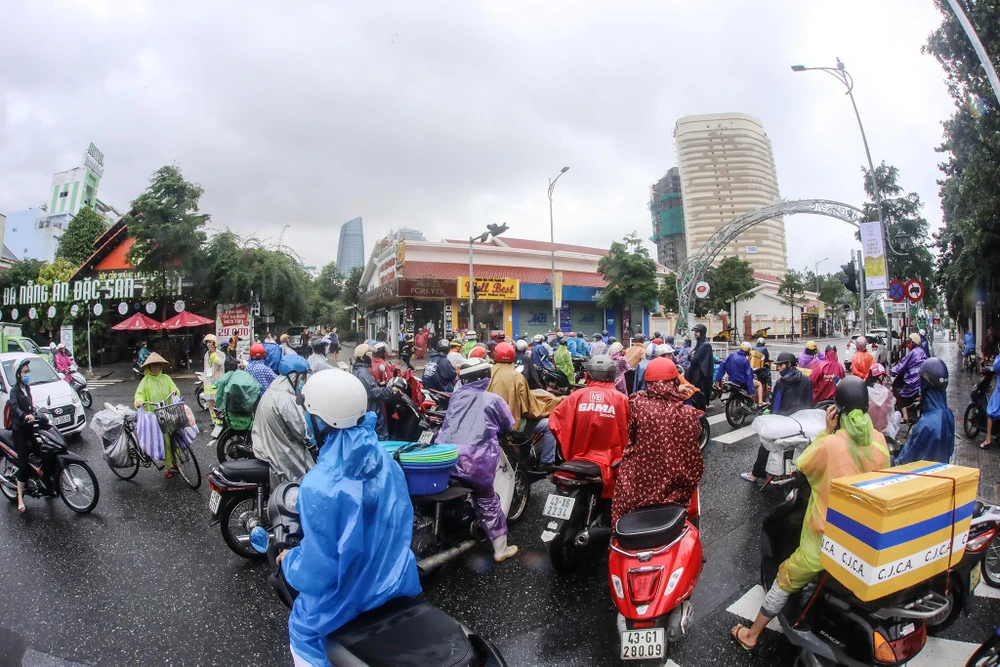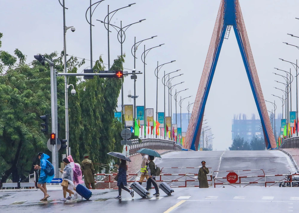 Các du khách buộc phải đi bộ về khách sạn. Một đoàn du khách đi bộ ngang cầu quay sông Hàn.