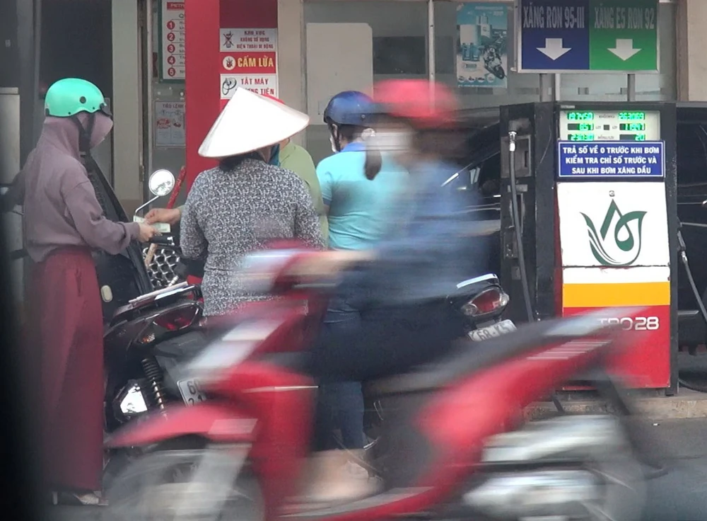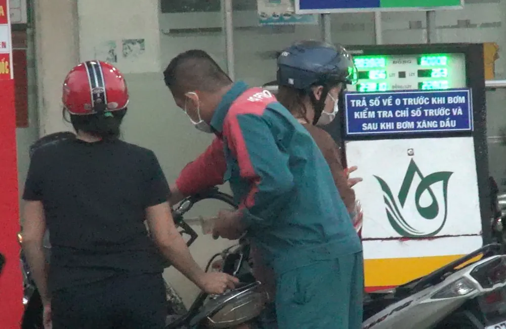 Chiều 17-3, trạm xăng có rất đông xe máy và xe tải vào đổ xăng. Hai nhân viên và cửa hàng trưởng liên tục bơm xăng cho khách, thu tiền.