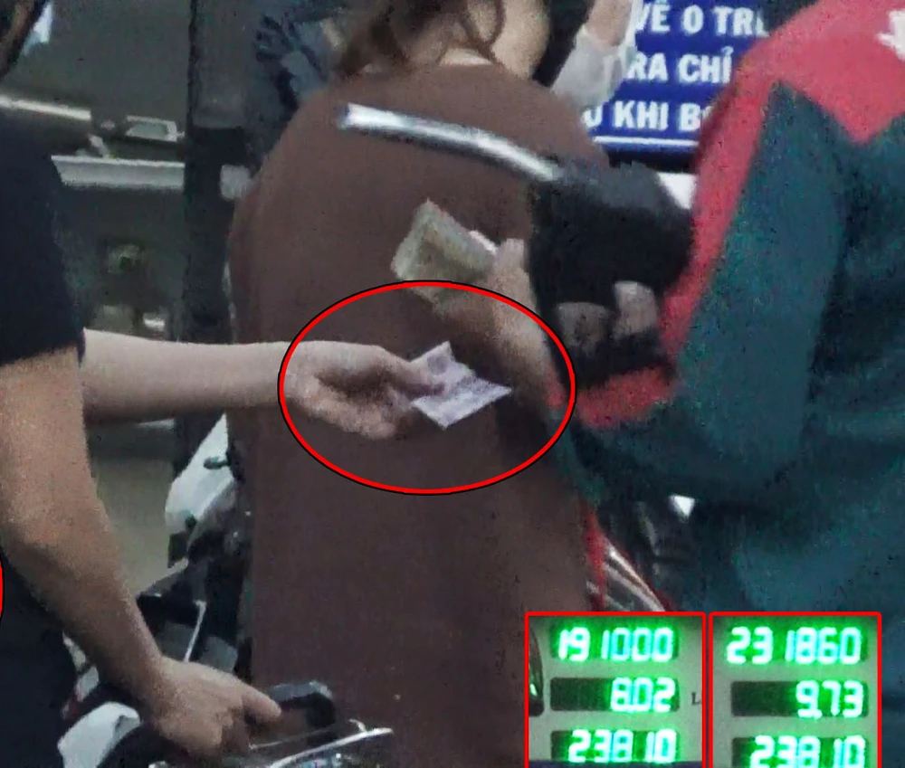 Liền ngay sau đó, sau khi bơm cho hai người thì nhân viên bơm xăng cho một xe máy khác do cô gái trẻ đi xe biển số Đồng Nai điều khiển. Đồng hồ trụ xăng đang hiển thị 110.400 đồng thì nhân viên này bơm nối số lên 150.200 đồng. Cô gái đưa tờ 100.000 đồng thì nam nhân viên trả lại 50.000 đồng và cô gái đã bị “móc túi” 10.200 đồng mà không hay biết.