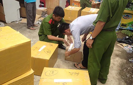 Bước đầu công an thu giữ, niêm phong tổng cộng 137 thùng hàng hóa và tiến hành mời ông Phú, ông Vinh làm việc.