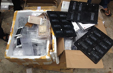 Các thùng hàng chứa linh phụ kiện iPhone và iPad nghi nhập lậu bị thu giữ. Ảnh: CTV