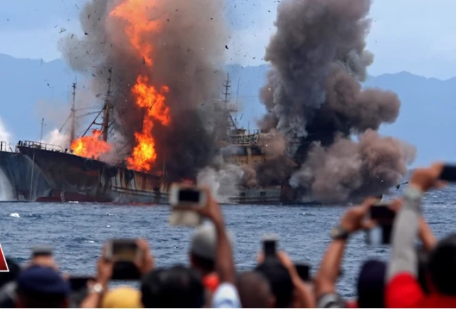 Tàu cá Việt Nam vi phạm lãnh hải, đánh bắt trộm hải sản bị Indonesia dùng chất nổ đánh chìm năm 2017.