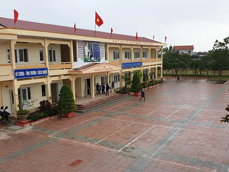 “Kỷ cương, tình thương, trách nhiệm”, một khẩu hiệu tại sân Trường THCS Duy Ninh. Ảnh: MQ