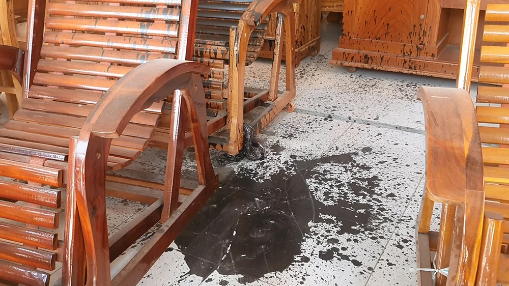 Sơn làm hư hại các tài sản bên trong cửa hàng kinh doanh đồ gỗ. Ảnh: NT