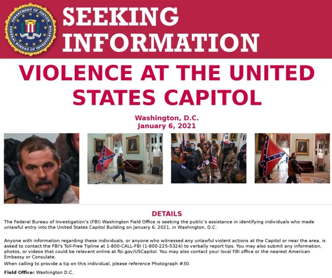 Theo kênh Fox News, Cục Điều tra Liên bang Mỹ (FBI) đang yêu cầu người dân giúp tìm một người đàn ông xuất hiện trong camera an ninh tuần hành bất hợp pháp qua Điện Capitol. Người này lúc đó cầm một lá cờ Liên minh miền nam Mỹ (sử dụng trong những năm nội chiến Mỹ) trong cuộc bạo loạn tuần trước.