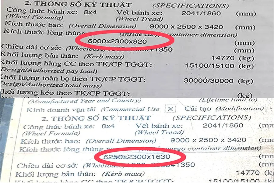 Khi bị CSGT dừng xe kiểm tra, tài xế xuất trình sổ đăng kiểm có các thông số kỹ thuật của thùng xe ghi rõ chiều dài, chiều rộng, chiều cao thứ tự là 6.250 x 2.300 x 1.630 mm.