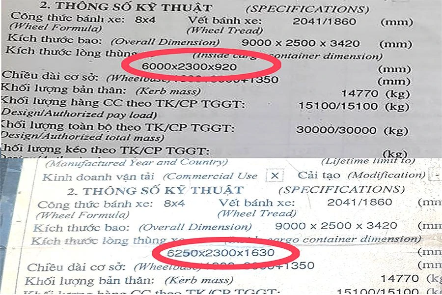 Thông số lòng thùng xe lưu trữ của Cục Đăng kiểm (ảnh trên) khác với thông số lòng thùng xe của sổ đăng kiểm do Trung tâm Đăng kiểm xe cơ giới 6302D cấp. Ảnh: T.SANG