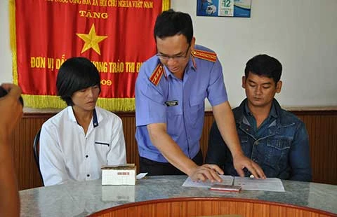 Trần Văn Đở (trái) và Khâu Sóc là hai trong số bảy người bị bắt giam oan ở tỉnh Sóc Trăng nhận tiền bồi thường ngày 14-1-2015. Ảnh: T.VŨ