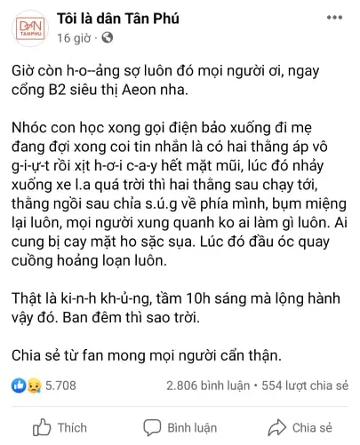 Theo chia sẻ, vụ việc xảy ra vào khoảng 10 giờ sáng 6-3, một phụ nữ đứng trên đường N4 (phường Sơn Kỳ, quận Tân Phú) để đón con đi học về thì bị hai thanh niên áp sát xịt hơi cay, cướp giật điện thoại.