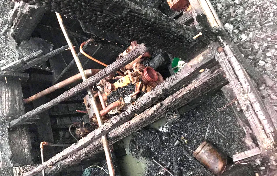 Tàu cá của gia đình ngư dân Nguyễn Hữu Được bị cháy rụi gần như khó khắc phục. Ảnh: ĐT