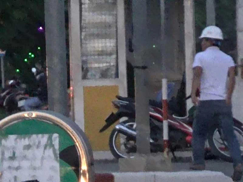 Người đội nón công nhân chạy vào chốt trao đổi với CSGT.