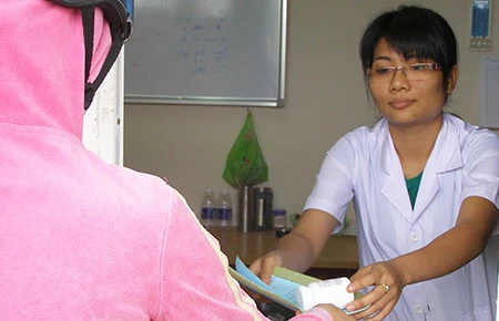 Một bệnh nhân HIV (bìa trái) đang nhận thuốc ARV tại Trạm Y tế xã Xuân Thới Thượng, huyện Hóc Môn (TP.HCM). Ảnh: TRẦN NGỌC