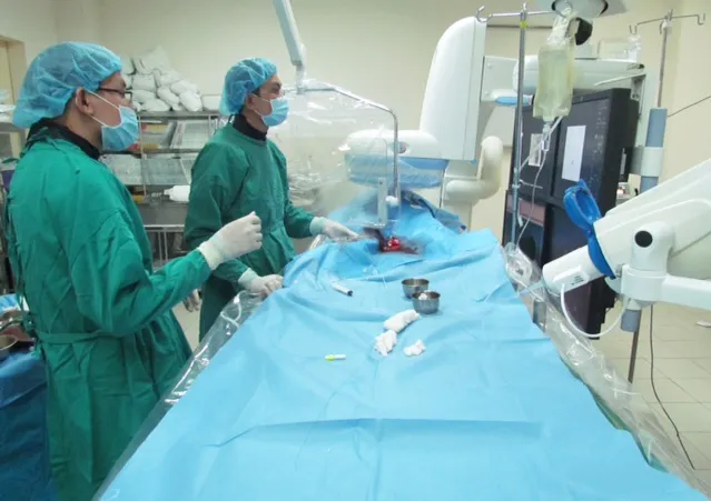 ThS-BS Trương Hoàng Minh (Trưởng khoa Ngoại niệu ghép thận), BS Trần Thanh Vũ (Trưởng đơn vị Can thiệp mạch máu) cùng các bác sĩ khoa Chẩn đoán hình ảnh tiến hành điều trị bằng kỹ thuật can thiệp làm tắc động mạch tuyến tiền liệt.