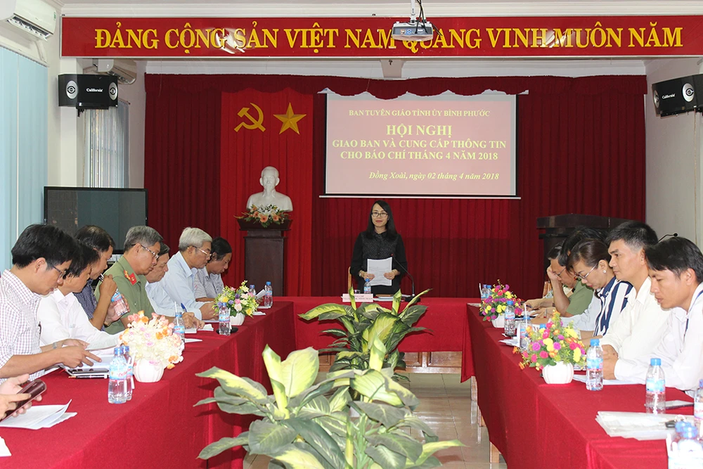 Chiều 2-4, Ban Tuyên giáo Tỉnh ủy, Sở TT&TT tỉnh Bình Phước đã tổ chức hội nghị giao ban và cung cấp thông tin cho báo chí tháng 4. Bà Nguyễn Thị Minh Nhâm, Phó Trưởng ban Thường trực Ban Tuyên giáo, chủ trì hội nghị.
