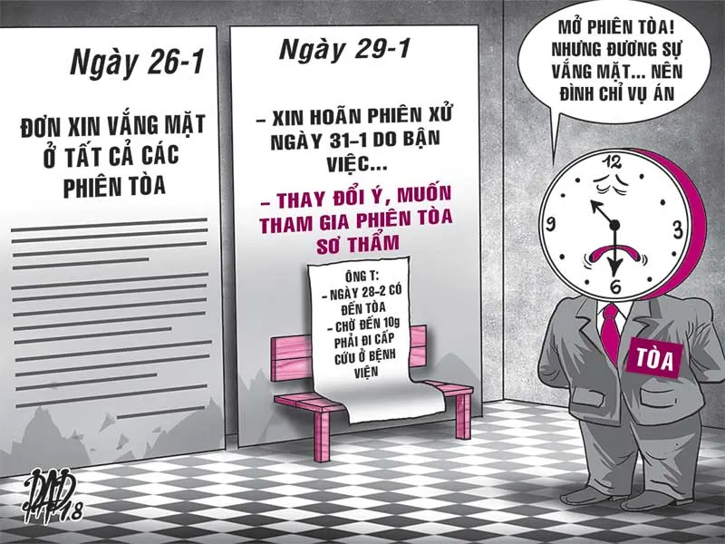 Khi HĐXX đột ngột mở phiên tòa như trên, LS báo tin cho ông T. Ông chạy vào trễ 15 phút thì thấy HĐXX đang đọc quyết định đình chỉ giải quyết vụ án.