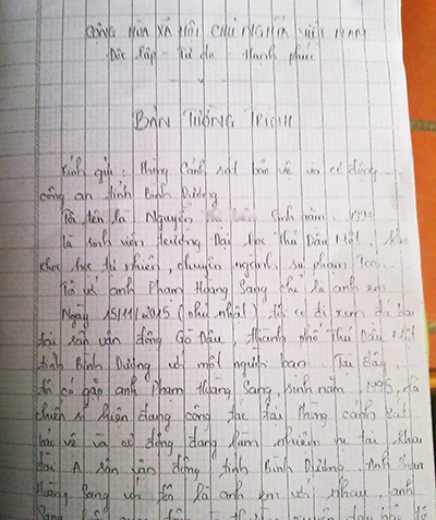 Bản tường trình của cô gái bị CSCĐ Sang tát tai. Ảnh: VH