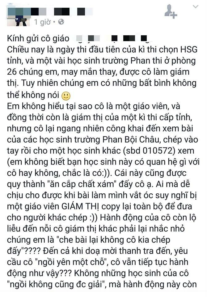 Đêm 14-3, sau khi dự kỳ thi học sinh giỏi tỉnh Nghệ An năm học 2016-2017, em LTPA (17 tuổi,Trường THPT chuyên Phan Bội Châu, TP Vinh, Nghệ An) đã lên Facebook chia sẻ cảm nghĩ và nêu rõ có tiêu cực trong kỳ thi.