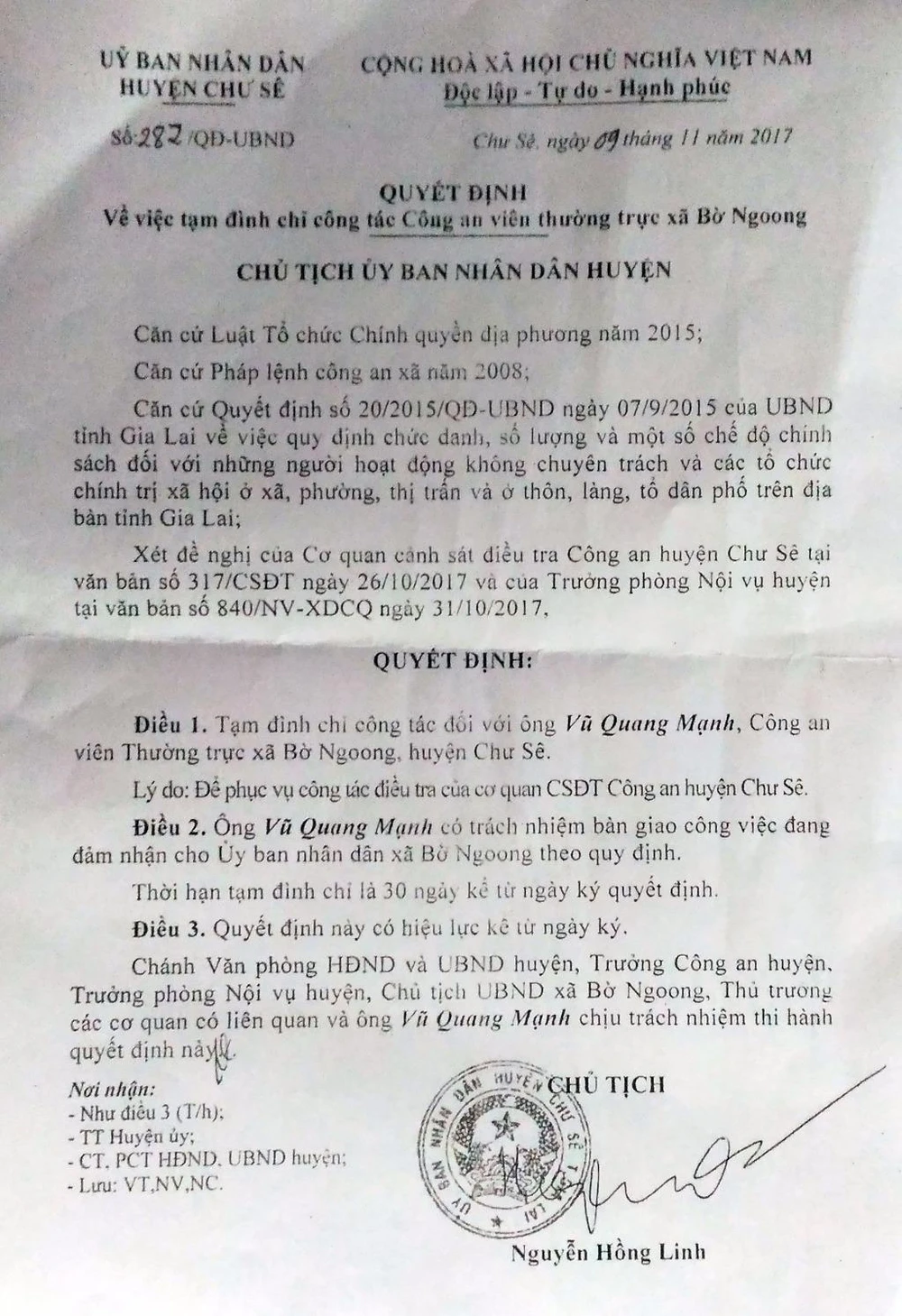 Chủ tịch UBND huyện Chư Sê (Gia Lai) Nguyễn Hồng Linh vừa ký quyết định tạm đình chỉ công tác đối với ông Vũ Quang Mạnh, công an viên xã Bờ Ngoong, để phục vụ công tác điều tra của Công an huyện Chư Sê.