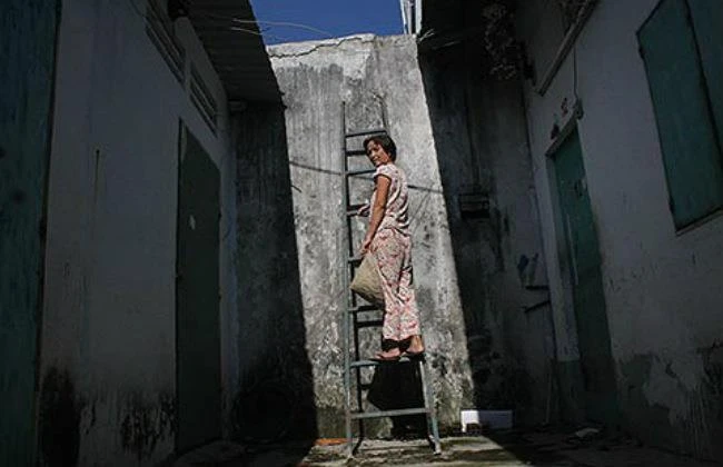 Gia đình anh Ân cùng những người trong khu trọ phải bắc thang, trèo qua tường để đi ra ngoài.