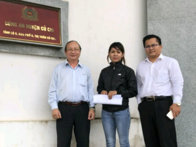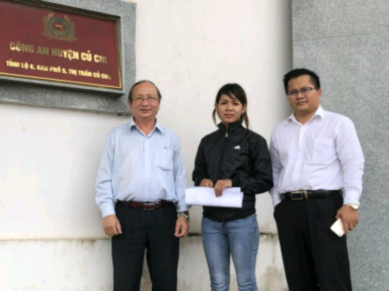 Bé Trúc cùng LS Kim Ron Tha, LS Trịnh Công Minh tại Công an huyện Củ Chi.
