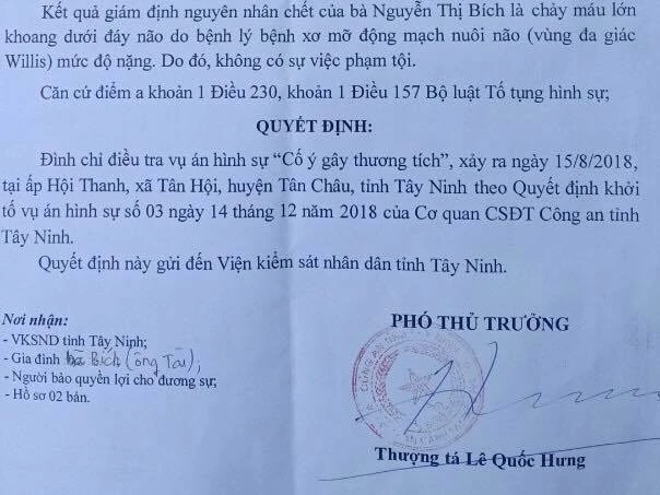 Ngày 15-12, Cơ quan CSĐT Công an tỉnh Tây Ninh ban hành quyết định đình chỉ điều tra vụ án cố ý gây thương tích mà nạn nhân là bà Nguyễn Thị Bích (SN 1968, Tân Châu, Tây Ninh).