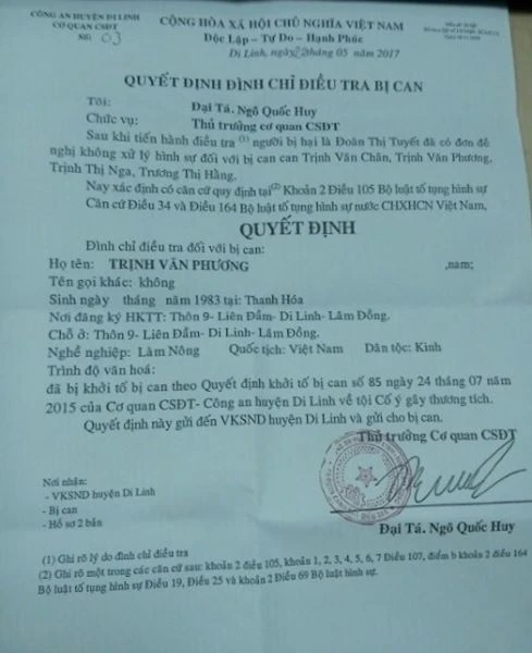 Anh Phương cho biết, công an huyện Di Linh, Lâm Đồng vừa mời bốn người trong gia đình anh lên nhận quyết định đình chỉ điều tra bị can. Trong quyết định nêu rõ: “Sau khi tiến hành điều tra người bị hại là Đoàn Thị Tuyết đã có đơn đề nghị không xử lý hình sự đối với bị can Trịnh Văn Chân, Trịnh Văn Phương, Trịnh Thị Nga, Trương Thị Hằng”, nên từ đó cơ quan điều tra đình chỉ điều tra đối với tội cố ý gây thương tích.