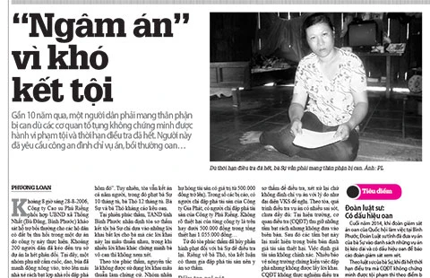 Báo Pháp Luật TP.HCM ngày 25-3 có bài “Ngâm án vì khó kết tội” phản ánh chuyện bà Tiêu Thị Sự (Bù Đăng, Bình Phước) gần 10 năm qua phải mang thân phận bị can. Bà Sự đã yêu cầu cơ quan tố tụng đình chỉ điều tra vụ án, đình chỉ điều tra bị can và bồi thường oan cho bà vì cơ quan tố tụng không chứng minh được hành vi phạm tội của bà và thời hạn điều tra đã hết.