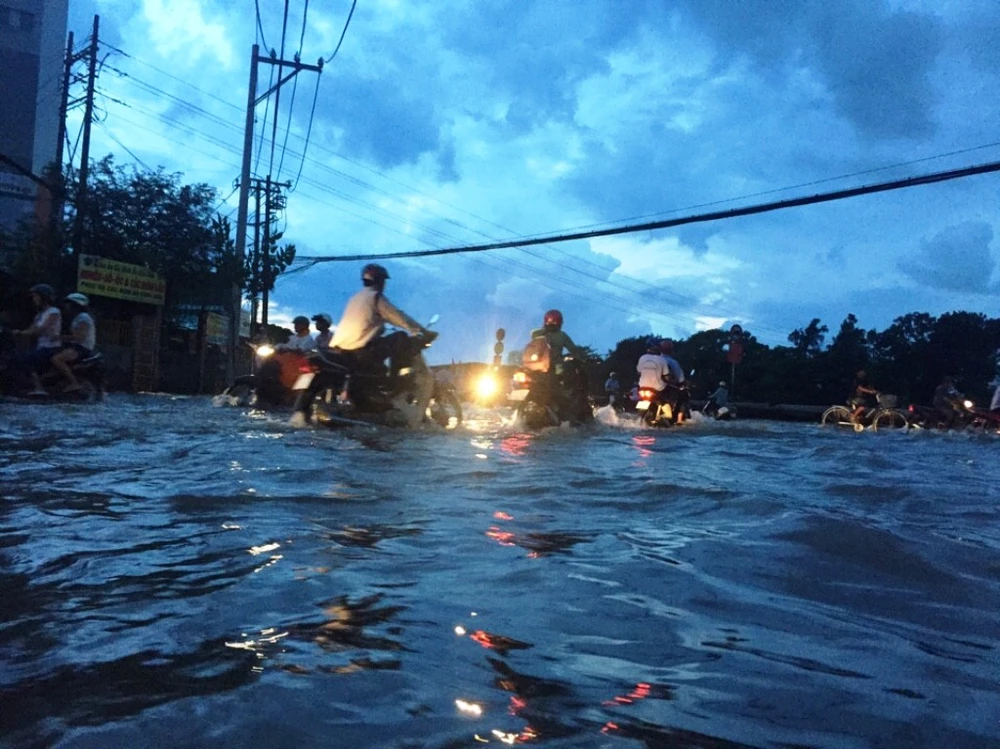 Theo đó, triều cường chiều 17-10 ước đạt 1,63 m lúc 5 giờ và 1,66 m lúc 18 giờ khiến một số tuyến đường ở phường Hiệp Bình Chánh, Hiệp Bình Phước (quận Thủ Đức) nước ngập sâu.