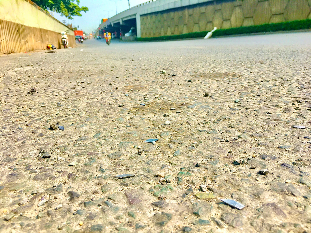 Đinh xuất hiện dày đặc trên đường. Ảnh: NGUYỄN YÊN