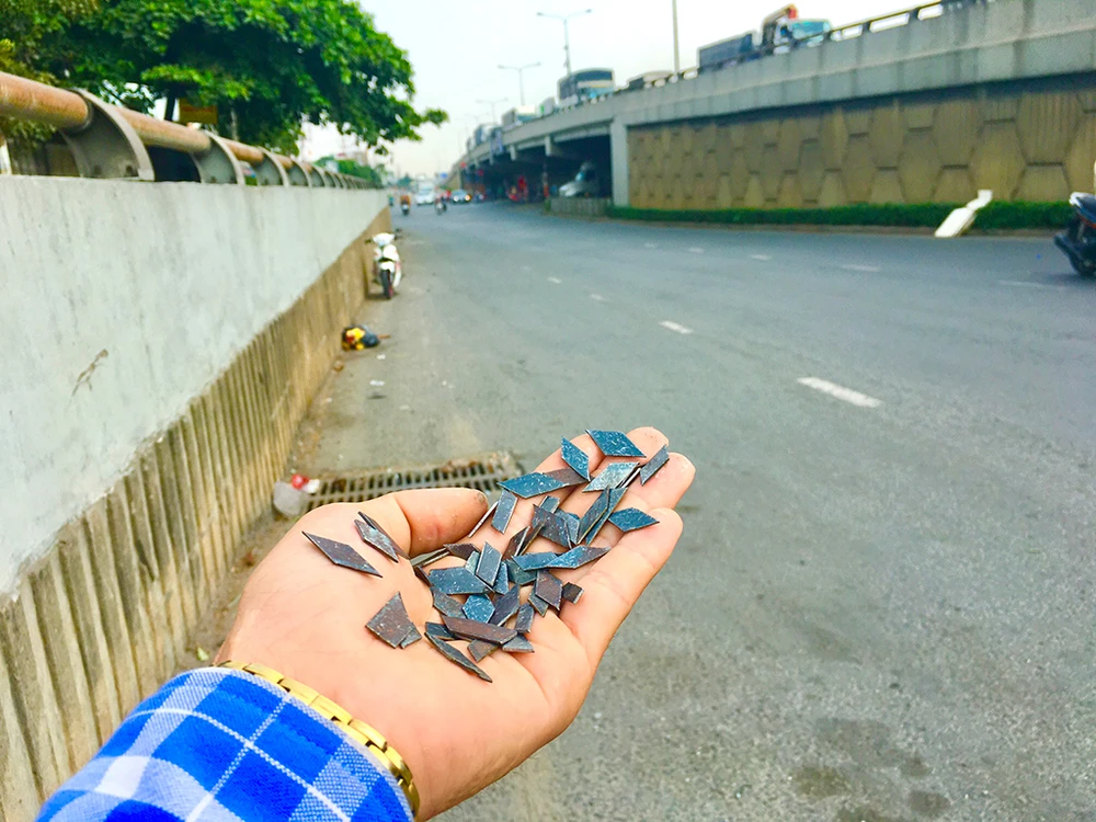 Ghi nhận vào chiều 3-2, đinh dạng hình “át rô” được cắt với kích thước nhỏ được rải dày dọc tuyến quốc lộ 1 đoạn từ cầu vượt Linh Xuân về quận 12.
