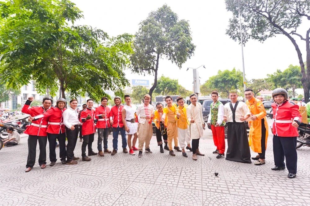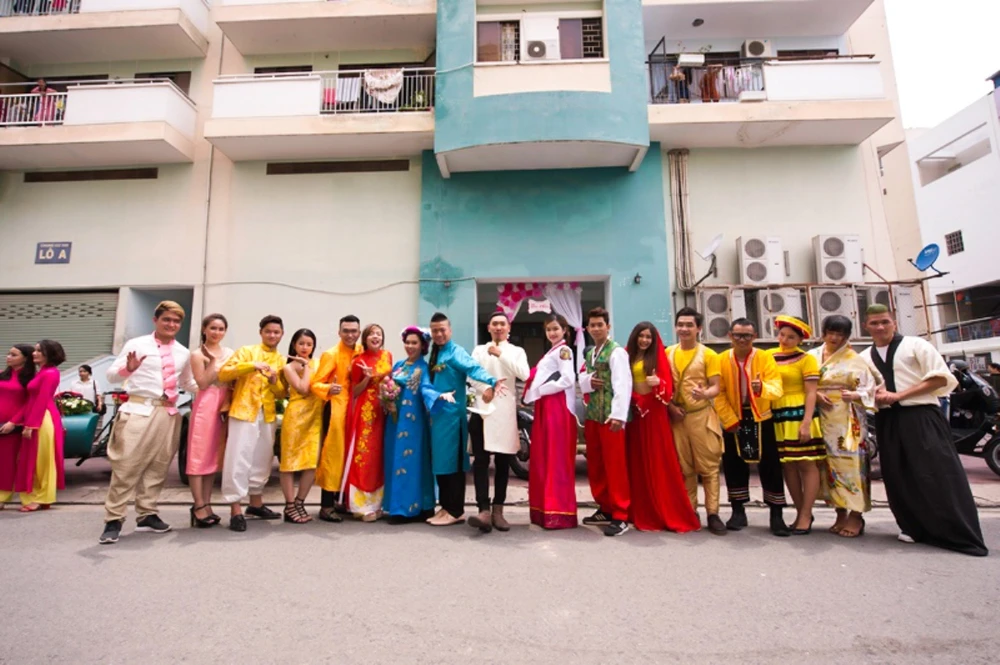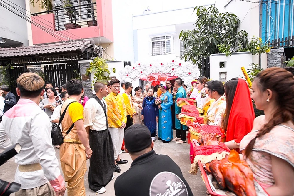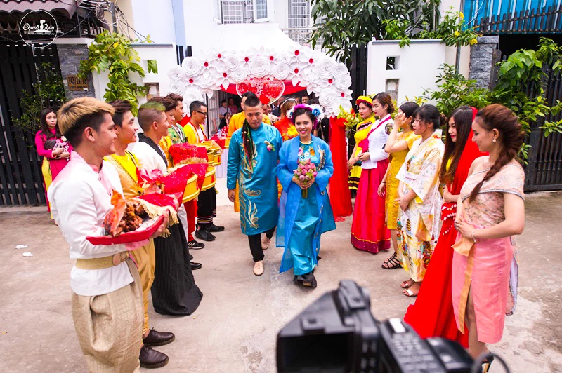 Sáng nay (28-9), cùng các đàn em thân thiết, chú rể Wang Trần đã chính thức xuất quân “đưa nàng về dinh”. Dàn bưng quả ngay khi xuất hiện đã lập tức thu hút đông đảo khách đi đường khi vận trang phục dân tộc các nước: Thái Lan, Campuchia, Ấn Độ, La Mã, Hàn Quốc, Nhật Bản... theo đúng concept chính của đám cưới “Trái đất này là của chúng mình”.
