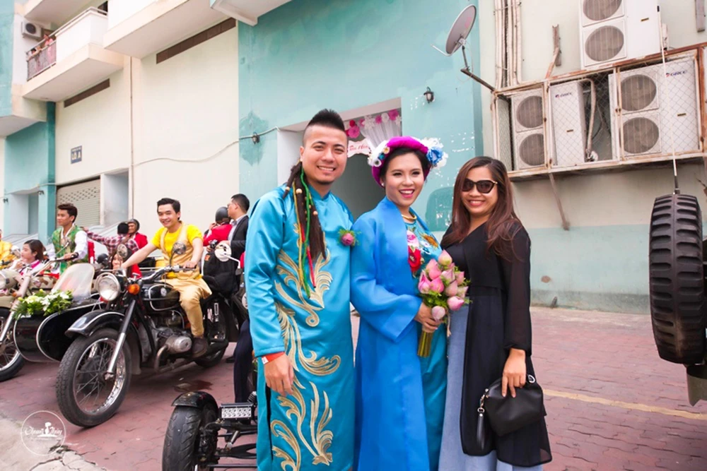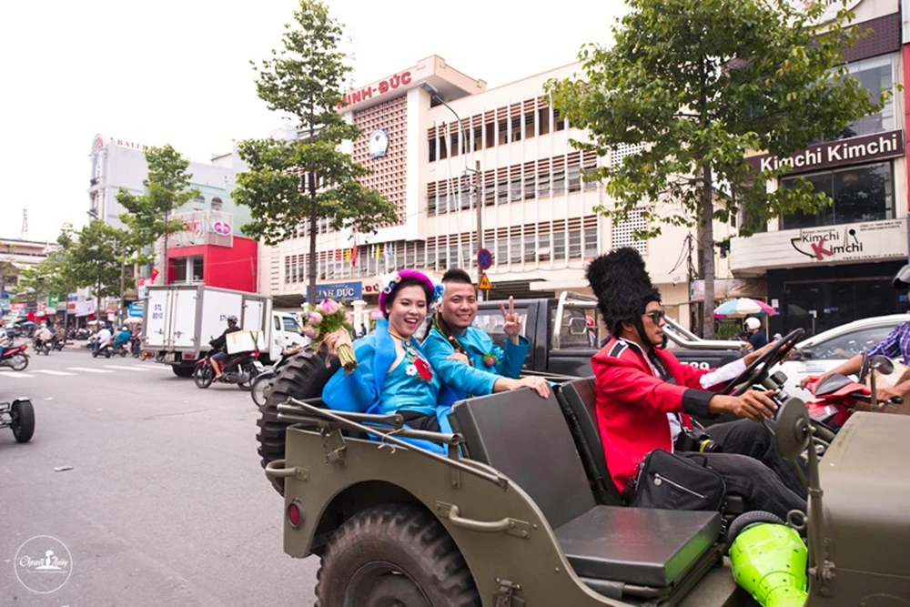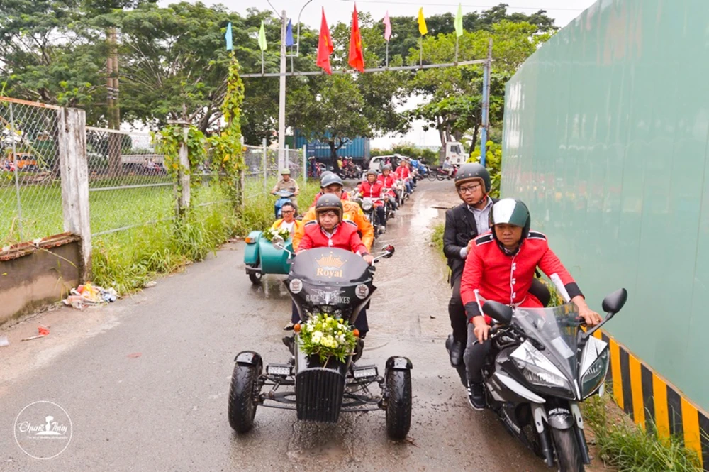 Dàn rước dâu hoành tráng, quy tụ hơn 10 mô tô cổ, sidecar, đi đầu là xe jeep chở chú rể Wang Trần và cô dâu Thanh Nhân.