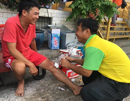 Tiền đạo Công Tuấn của báo Pháp Luật TP.HCM dù gặp chấn thương rất đau nhưng vẫn cười tươi trước sự chăm sóc nhiệt tình của đội ngũ y tế tại giải.