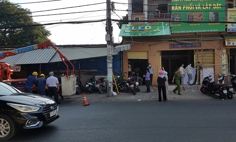 Đến chiều 30-3, lực lượng chức năng quận Tân Phú (TP.HCM) vẫn đang khám nghiệm hiện trường, điều tra vụ tai nạn lao động khiến một người tử vong.