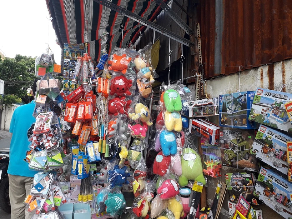 Tại một cửa hàng ngay trước cổng trường Tiểu học An Lạc 3, hàng loạt đồ chơi trẻ em được bày ở mặt tiền. Những đồ chơi này chủ yếu được lấy từ Chợ Lớn.