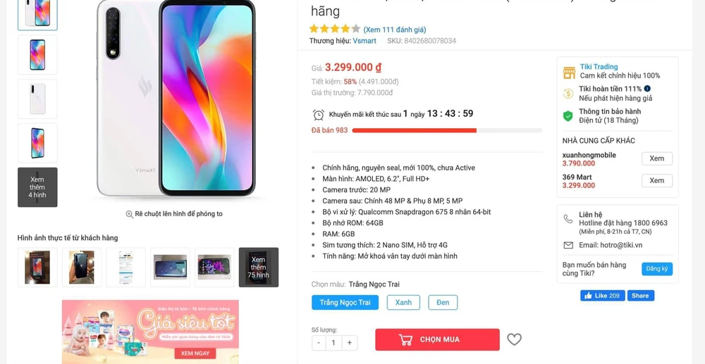 Anh Minh Long (quận Tân Phú) chia sẻ trong lúc chọn mua điện thoại trên một sàn TMĐT có tiếng, điện thoại Vsmart Live được giới thiệu là giảm 58% so với giá thị trường, từ 7,790 triệu đồng còn 3,299 triệu đồng. Theo anh Long, thực tế giá thị trường của hãng này chỉ từ 3,4 triệu đồng. Tức cao hơn mức giảm khủng 58% hơn 100.000 đồng.