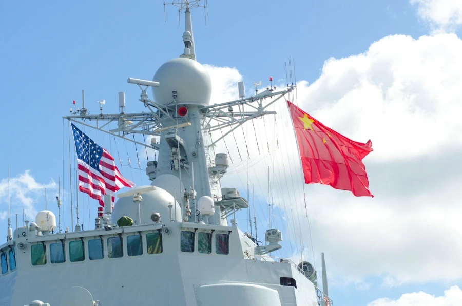 Cờ Trung Quốc và cờ Mỹ trêm tàu khu trục mang tên lửa dẫn đường Xian của Trung Quốc vào ngày 8-7-2016. Con tàu này được neo đậu tại căn cứ Pearl Harbor-Hickam, Hawaii cho cuộc tập trận Vành đai Thái Bình Dương. Ảnh: STRIPES