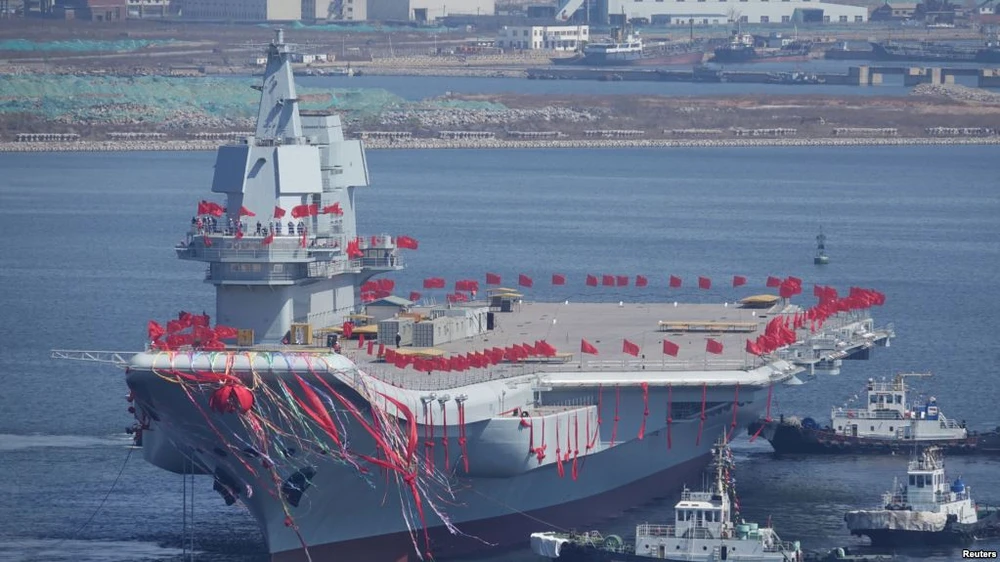 Tàu sân bay tự đóng đầu tiên của Trung Quốc tại cảng Dalian, tỉnh Liêu Ninh ngày 26-4-2017. Ảnh: XINHUA